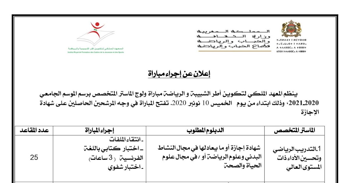 مباراة ولوج الماستر المتخصص بالمعهد الملكي لتكوين أطر الشبيبة والرياضة 2020 2021