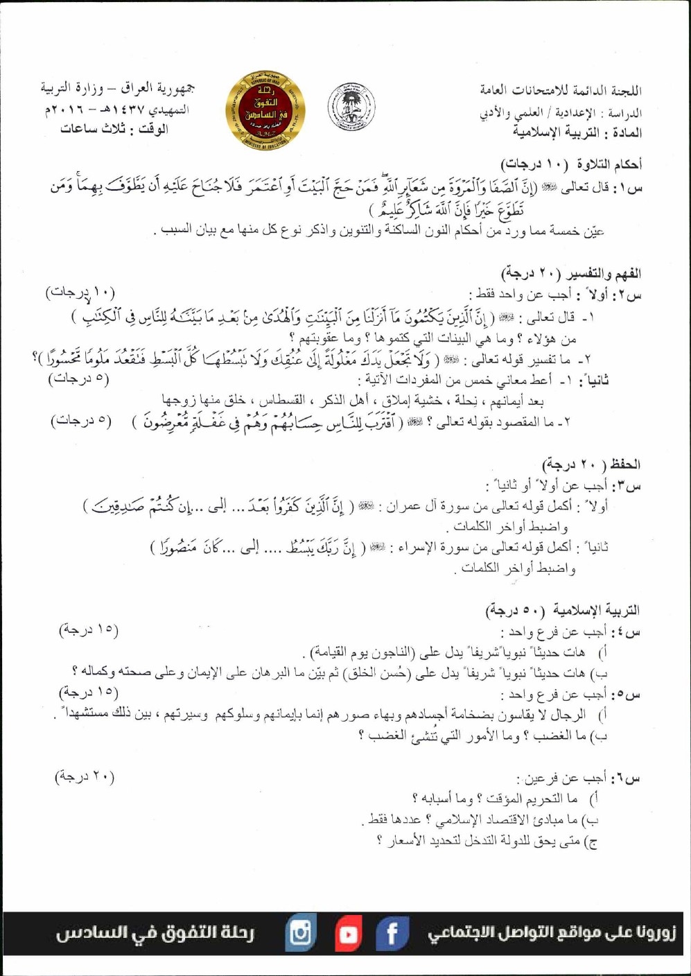 المجموعة الكاملة للاسئلة الوزارية لمادة الاسلامية من سنة تغيير المنهج 2016 والى2017 لجميع الادوار