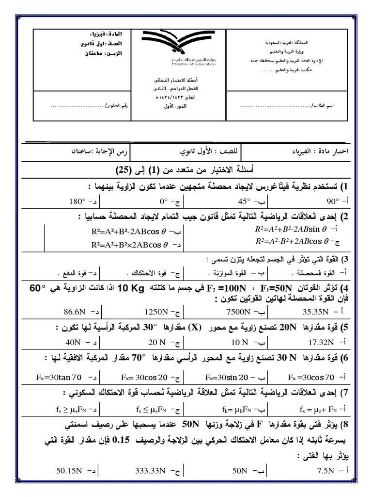 اختبار مادة الفيزياء 1 ث الفصل الدراسي الثاني
