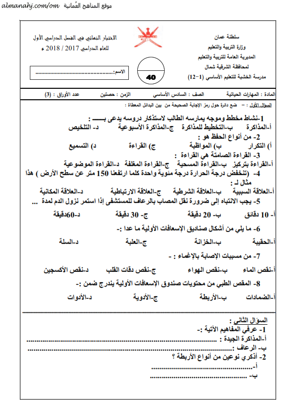 أسئلة الاختبار النهائي في مادة المهارات الحياتية للصف السادس في محافظة شمال الشرقية الفصل الاول