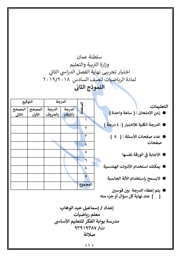نموذج اختبار تجريبي في الرياضيات للصف السادس الفصل الثاني 2018 2019