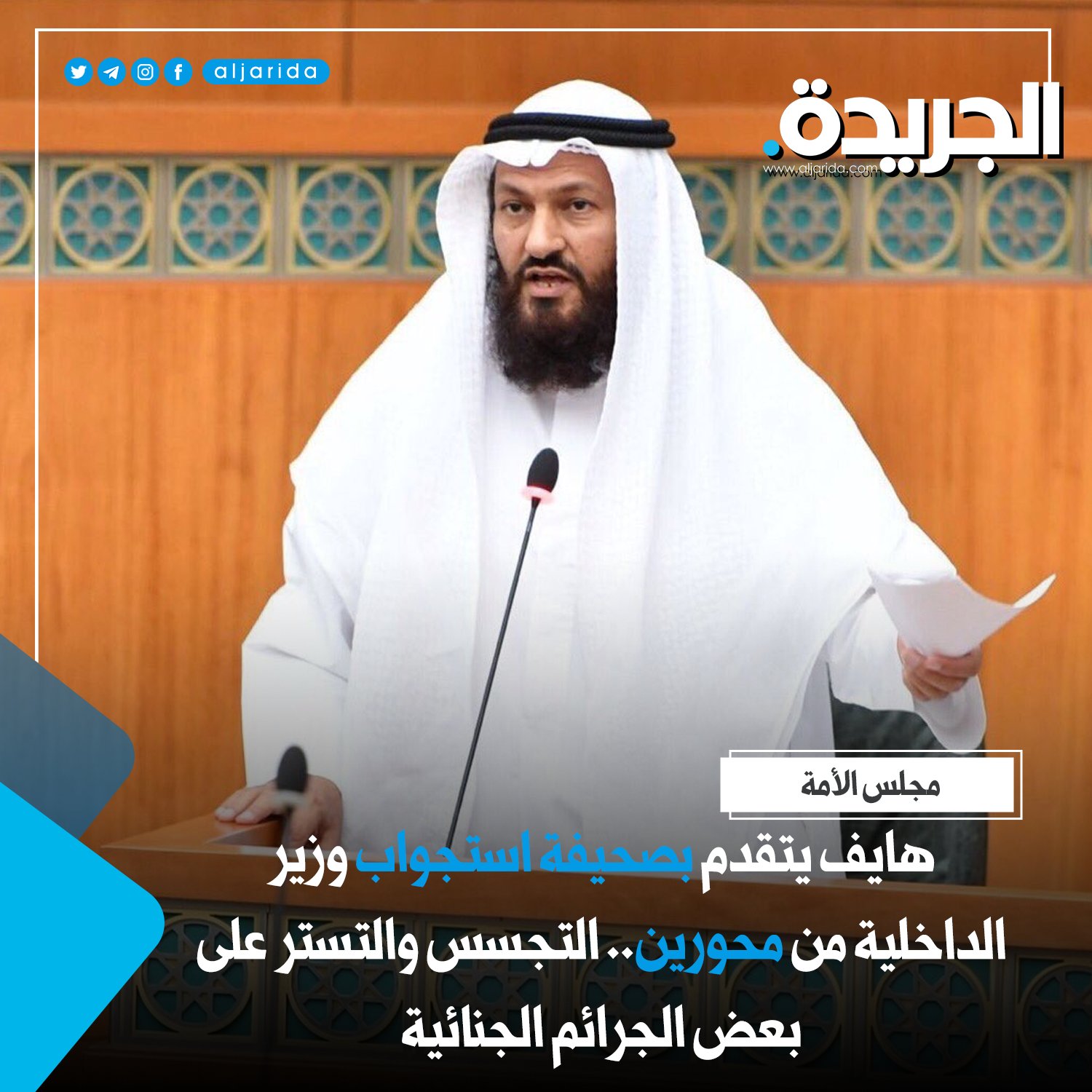 صحيفة الجريدة النائب محمد هايف يتقدم رسميا بصحيفة استجواب وزير الداخلية أنس الصالح من محورين التجسس على المواطنين والتستر على بعض الجرائم الجنائية