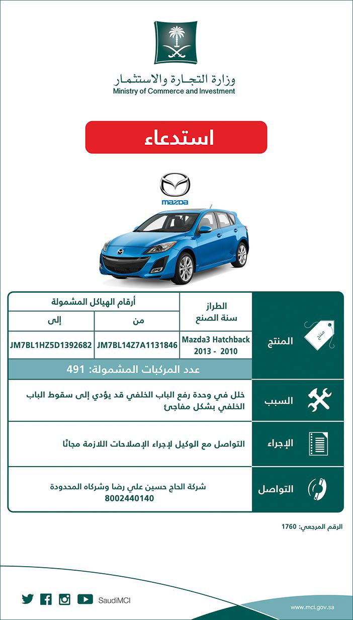 وزارة التجارة On Twitter وزارة التجارة تعلن استدعاء سيارات مازدا 6 الترا المصنعة مابين عامي 2009 2012م لوجود خلل في براغي الأبواب Http T Co Xetrav0iod