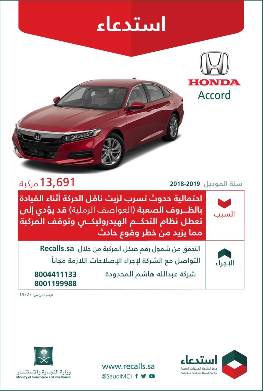 وزارة التجارة No Twitter التجارة تعلن عن استدعاء 13 691مركبة هوندا أكورد 2018 2019 لاحتمالية حدوث تسرب لزيت ناقل الحركة أثناء القيادة بالظروف الصعبة العواصف الرملية قد يؤدي إلى تعطل