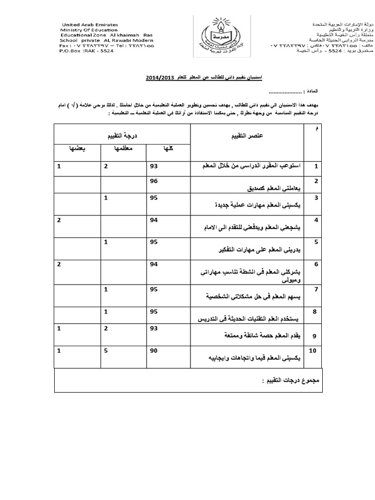 استبيان تقييم ذاتي للطالب عن المعلم للعام 2014