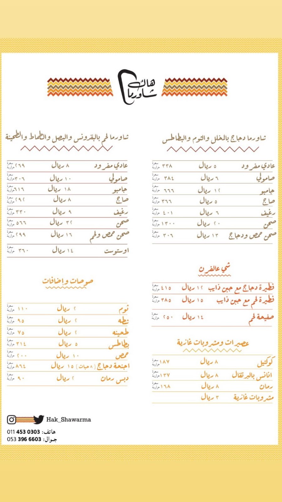 منيو هاك شاورما وارقام التواصل وموقعهم وحسابهم في الانستقرام
